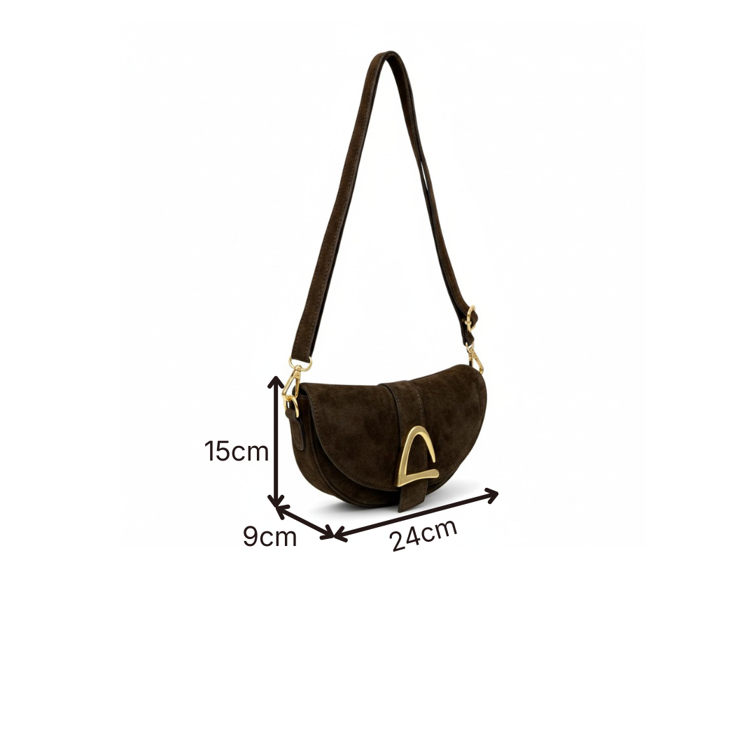 Este bolso de ante tiene una forma de media luna muy favorecedora que se apoya justo bajo el hombro y queda súper elegante sin esfuerzo. Es ligero, suave al tacto y con el tamaño perfecto para el día a día: lo bastante compacto para verse fino, pero con espacio de sobra para llevar lo importante.